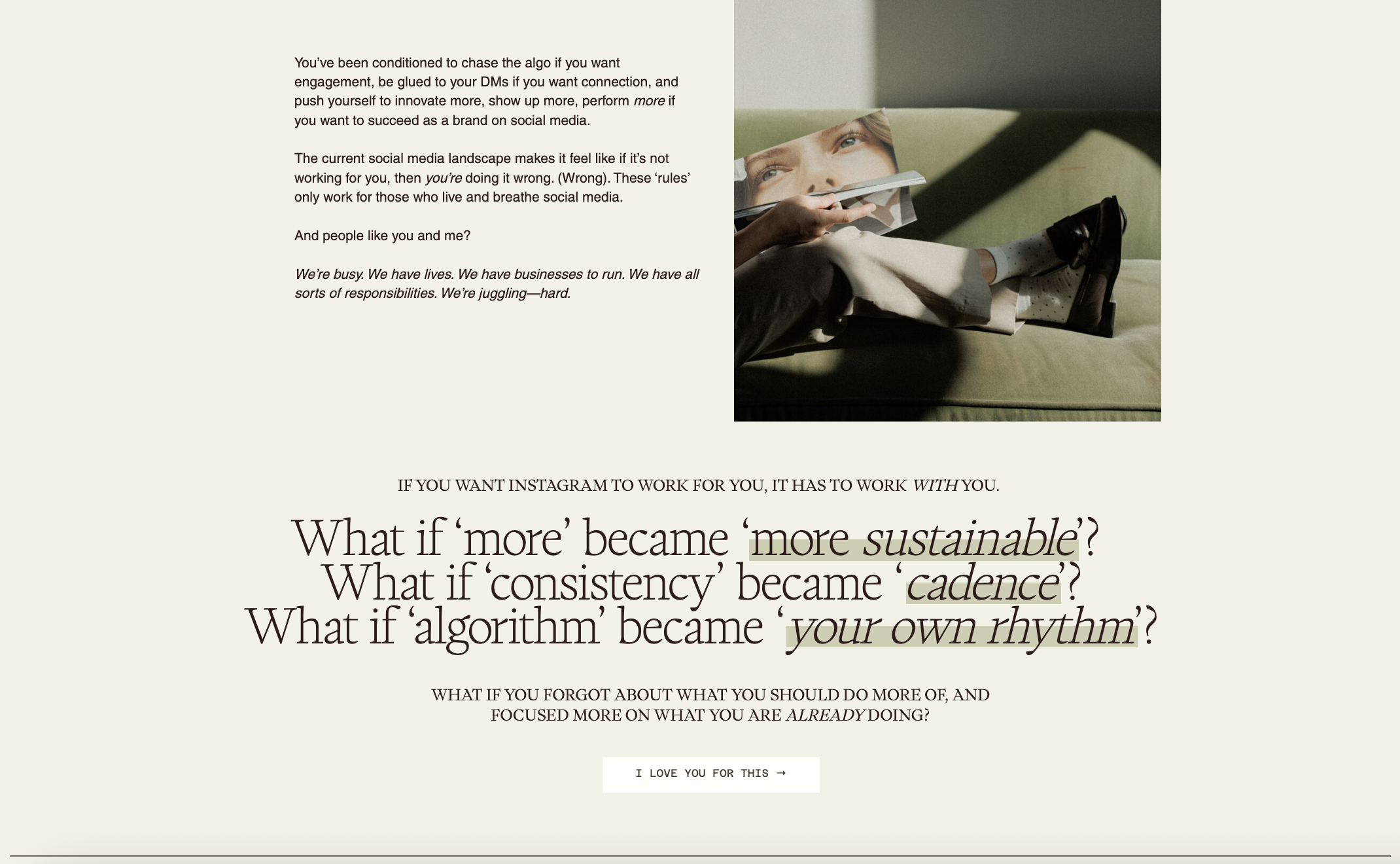 To give your reader something to reflect on, which could act as a the emoji equivalent of 👀 or a mic-drop moment, as I like to call it. The purpose behind this kind of question is to give them something to think about as you lead them into the next section of your sales page or website. Here is an example of leveraging reflection questions for About Monday’s Scoops Sales Page. We wanted to redefine what “more” could mean for people ready to leverage social media for their business. Instead of leaning into this expectation of having to “do more,” we wanted to introduce the idea that all of these terms we often negatively associate with social media could actually be framed in a positive, generative way. This philosophy is what grounds Melo’s Scoops offer and acts as a perfect introduction to Scoops; if her reader gels with these reframes, they’re going to love what Scoops is all about.
